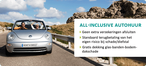 Met een huurauto van Sunny Cars hoef je je nergens druk om te maken. Je huurauto is namelijk standaard optimaal verzekerd. Dus ook tegen schade aan glasbanden-bodem-dak en diefstal. Gaat er toch iets mis? Geen paniek. Tenzij je het zelf wel heel bont gemaakt hebt, betalen we het eigen risico gewoon aan je terug.