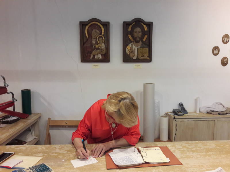 Mercedes schrijft een boodschap op de ansichtkaart voor haar zoon Federico inde souvenirwinkel van het klooster. Foto: Casper Molenaar