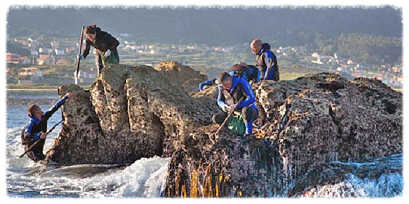 Wij waren aan de kust in Cabo Corrubedo bij de vuurtoren toen ze deze op spectaculaire manier van de rotsen aan het steken waren. De moedigste en meest ervaren mannen wat vaak over gaat op vader en zoon, laten zich door hun kameraden met snelboten naar de rotsen varen waar na deze voor op de boot staande mannen op de glibberige rotsen springen met een net aan hun middel en een steekijzer, gelijktijdig rollen de golven met volle kracht tegen de rotsen. Waanzinnige en Halsbrekende toeren, waarbij men de branding steeds in de gaten houdt. De Percebe of wel eendenmosselen die zich in een dichte laag vastgehecht hebben aan deze rotsen. In de maand juni en rond november, december gebeurd dit waarbij ze in deze tijd, spreek kerst en jaarwisseling nog veel duurder zijn. Zo ons verteld werdt zijn ook elk jaar 2 tot 3 doden te betreuren. Het droevige is eigenlijk dat toen het met de economie slecht ging in Spanje er vele het ook eens willen proberen zonder de ervaring en het materiaal. De gevolgen kun je raden.
